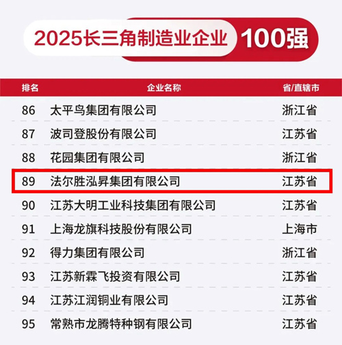 根据发布榜单,法尔胜泓昇集团荣登2025长三角制造业企业100强、2025长三角民营企业100强、2025长三角民营制造业企业100强榜单!