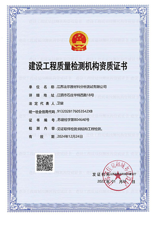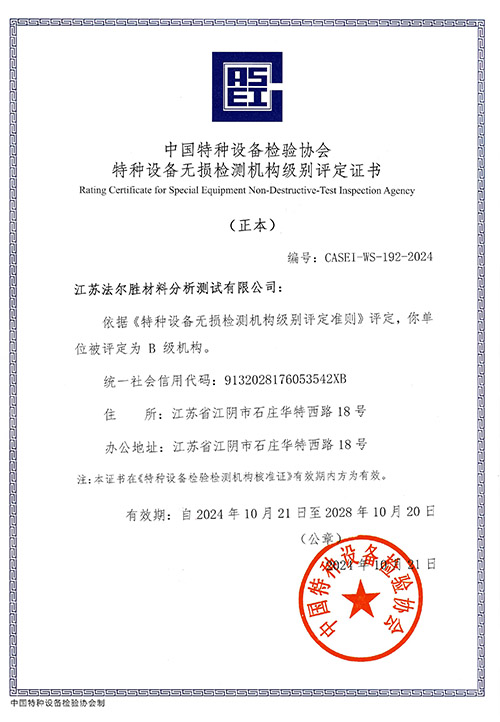 江苏法尔胜材料分析测试有限公司成立于1989年,一直从事专业的检测工作,江苏省高新技术企业和专精特新中小企业。拥有CMA、CNAS、特种设备无损检测、建筑钢结构检测、CCS等多个资质认可。检测内容包括材料的物理性能、机械性能、化学成分和构件无损检测;涉及领域包括桥梁工程、特种设备、建筑工程、机械、化工、风电等。