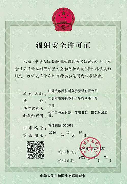 市场监督管理局检验检测机构资质认定(CMA)资质、国家实验室认可(CNAS)资质、中国船级社实验室认可(CCS)资质、国防科技工业实验室认可(DILAC)、特种设备无损检测机构核准资质和建设工程质量检测机构资质。可以出具市场监督局认可的第三方检测报告、世界64个国家互认的CNAS检测报告及多国船级社认可的检测报告。