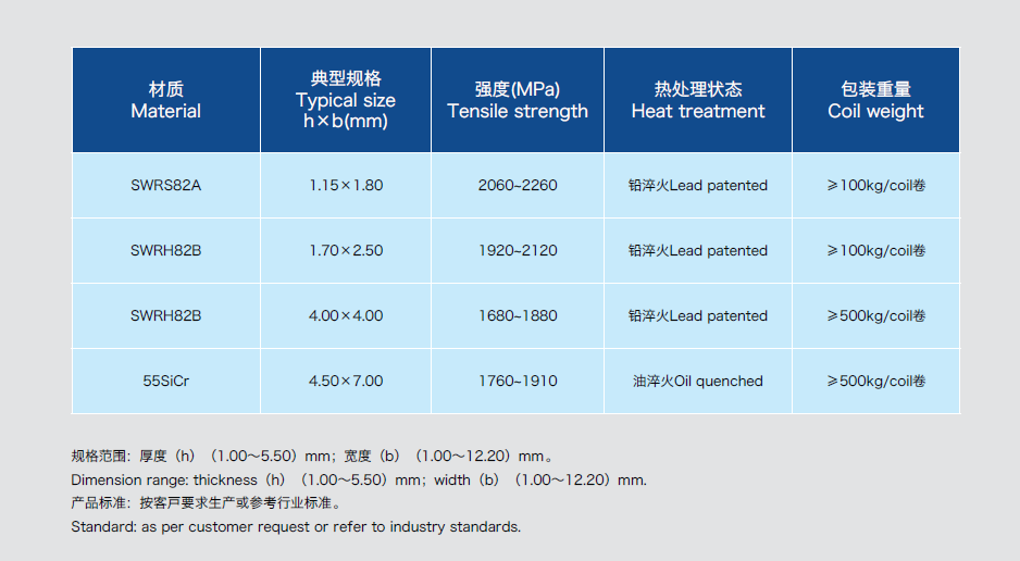 采用优质高碳钢或合金钢,成型稳定,色泽均匀,疲劳性能好