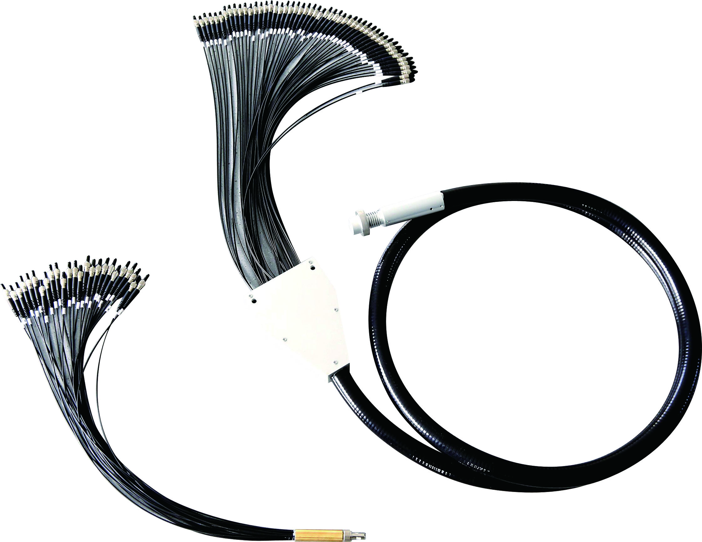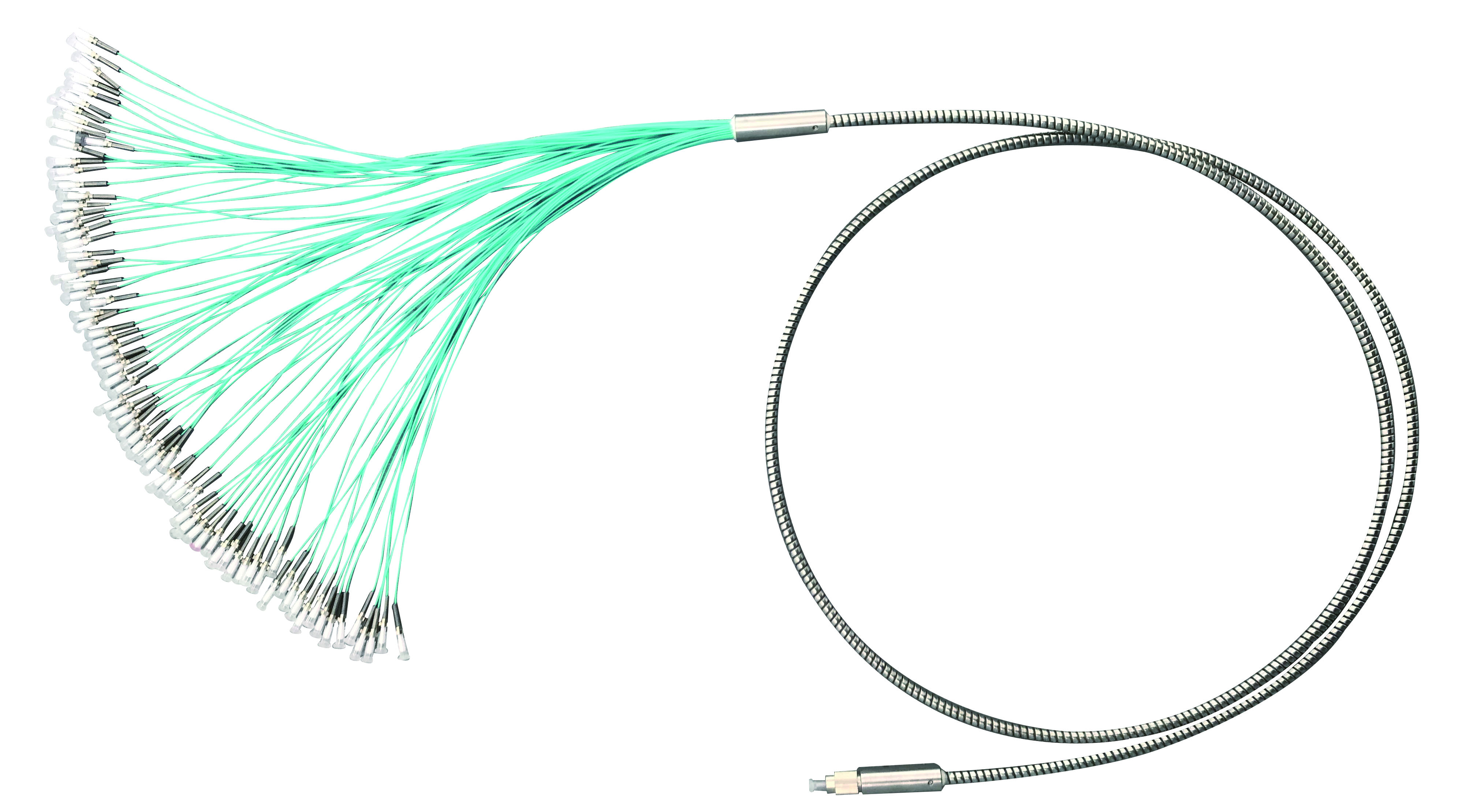 集束光纤是将分支端分别与激光器连接,使多路激光柔性传输至集束端, 汇聚成高功率光源, 单芯传输损耗小于 0.3dB。集束光纤由特殊工艺制作而 成,光纤端面能够长期承受 1000℃。产品性能稳定,安全性高,可按客户需 求实现不同芯数、不同传输波长、不同长度、不同接头的定制化解决方案。 集束光纤是全激光显示系统、激光直接成像(LDI) 等设备的关键核心部件。